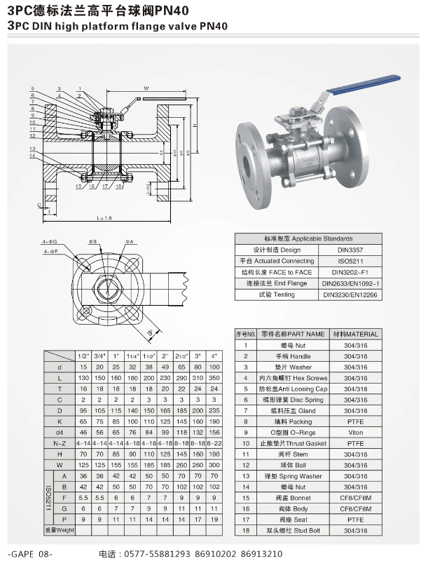 三片式高平臺德標(biāo)法蘭球閥PN40