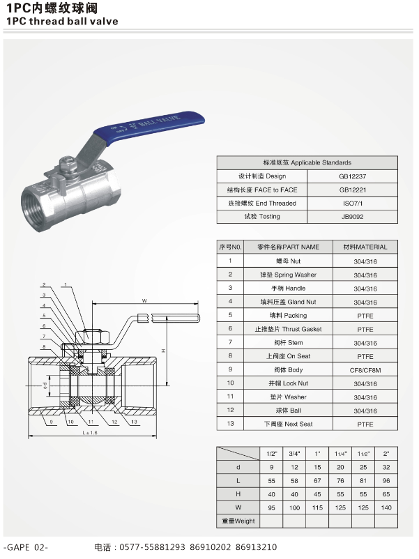 一片式內螺紋球閥適用于 PN1.0~4.0MPa,工作溫度 -29~180℃(密封圈為增強聚四氟乙烯)或 -29~300℃(密封圈為對位聚苯)的各種管路上,用于截斷或接通管路中的介質,選用不同的材質,可分別適用于水、蒸汽、油品、硝酸、醋酸等多種介質。優(yōu)點